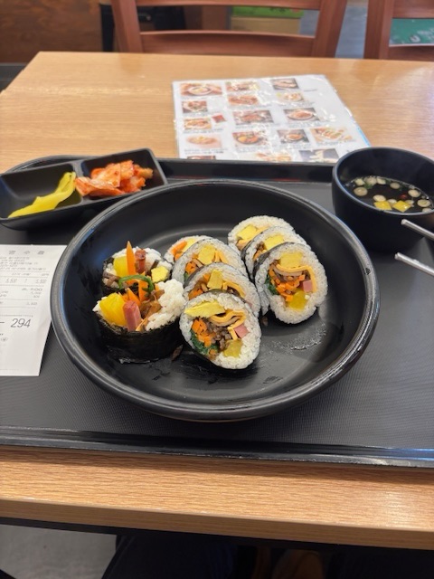 チーズキンパです。無料のキムチとたくあんが美味しいです。特に韓国のたくあんって本当に美味しいです。